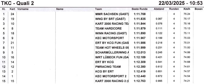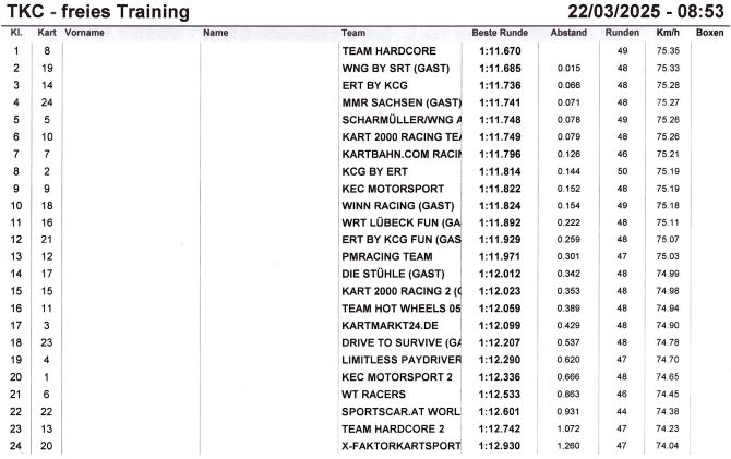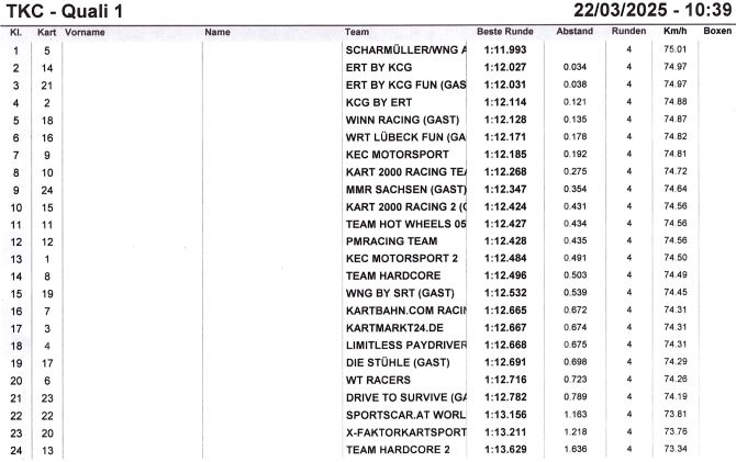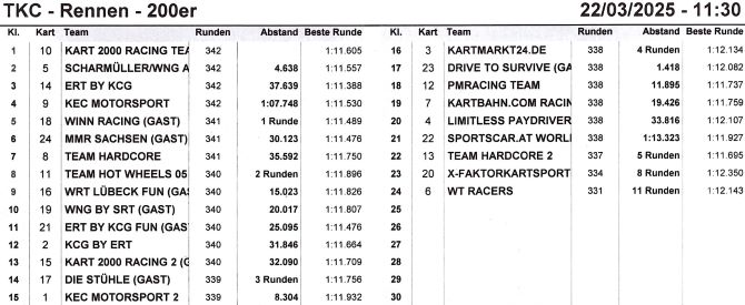 Fazit: Super TKC Raceweekend Auftakt 2025, 47 startende Teams, Samstag Bilderbuch Wetter/Sonntag eher so „naja“, starke Gastteams aus Polen, Österreich und Deutschland, vier Kartdefekten, kaum Gelblichphasen, 2 Zeitstrafen (einmal 500 Gramm Untergewicht, einmal Abschuss eines Gegners 5 min vor Schluss), gut vorbereiteten Karts mit 11 Ps Motoren, einer TOP Streckencrew, spannenden Zweikämpfen bis zum Schluss, Entscheidungen die so im Reglement verankert wurden, Neueinsteiger Teams/Comeback Teams/neu formierte Teams die super performten, tolle Stimmung, hässlichen gelben T-Shirts, einem dicken Knöchel, leider drei kurzfristigen Absagen, lecker gegrilltes, einem stark mitfahrendem Geschäftsführer, super guten Nachwuchsfahrern usw.