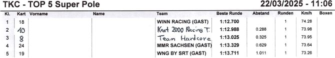 Den ersten Saisonpunkt im Jahr 2025, holte sich dann das Gastteam aus Polen (WINN Racing), indem es sich die Pole Position im „TOP 5 Super Pole Qualy“ sicherte. Es folgten auf den Plätzen dahinter, das Kart 2000 Racing Team, Team Hardcore, das Gastteam MMR Sachsen sowie das Gastteam WnG by SRT.