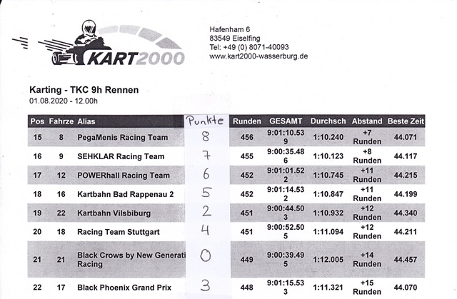 Mit 449 gefahrenen Runden auf Platz 21, das Gast/Nachwuchsteam aus Landsberg am Lech (Black Crows by New Generation Racing). Auch für die Jungs und Mädels der Black Crows ist es zum Teil das erste mal auf fremden Kartbahnen bzw. das Fahren in einem richtigen Langstreckenrennen. Macht weiter so, die Jugend schiebt nach, richtig so.