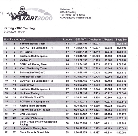 Sich kurzfristig noch einen freien Teamplatz ergattern konnte sich das Team der Kartbahn Vilsbiburg. Auch sie fielen durch eine sehr übersichtliche und faire Fahrweise auf. Ohne einen Fehler gemacht zu haben, beendeten sie ihr TKC Premieren Rennen auf Platz 19 und drehten dabei eine schnellste Rennrunde von 44.340 Sekunden.