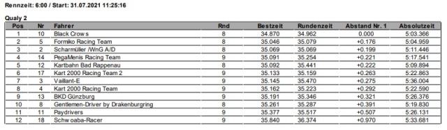 Fazit: Ein tolles Rennen mit 19 super starken und äußerst fairen Teams, Spannung bis zum Schluss, ein Zielfahren um die schnellste Rennrunde, Überraschungen im TOP 5 Qualy, starken Überholmanövern, super Stimmung, gut gerichteten und eingestellten Karts, drei Zeitstrafen wegen eines zu schnellen Fingers beim Karttauschbuzzer (Frühstart gedrückt), einer sehr gut funktionierenden Crew, einem Schuh der beim Karttausch im Kart hängen blieb und mit dem neuen Fahrer eine extra Runde drehte (Team Kartbahn Vilsbiburg, geile Nummer), nicht einer Gelblichphase während des ganzen Tages, leider einer abgerauchten Zündkerze welche dem Team Gentlemen-Driver by DBR ca. 4 Runden kostete, einem Mann der sich zwar die schnellste Rennrunde sicherte aber beim Fahrerwechsel dann auf dem Hosenboden in der Boxengasse landete, sehr fairen und aufmerksam fahrenden Gastteams, starken und immer mehr werdenden Nachwuchsfahrer, einer Premieren Pole Position fürs Team Black Crows, Zeitplan mit nur 7 Minuten Verzögerung eingehalten, einem Piep-Geräusch Einfahrt Boxengasse bei dem nun wirklich alle erst bei grün losfahren und einer schönen Siegerehrung mit tollen Pokalen und 25 Liter Freibier.