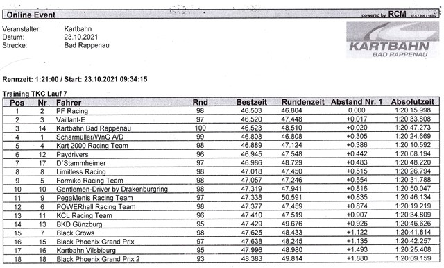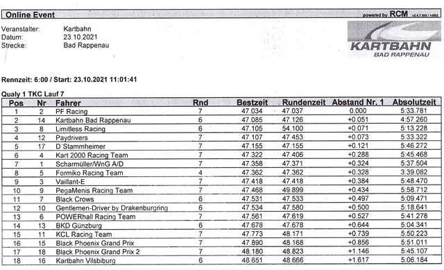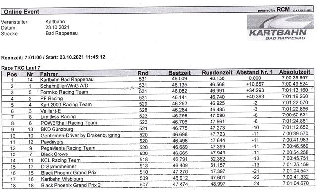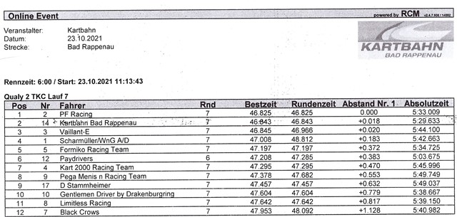Fazit: 18 faire und fehlerfreie Teams (danke das ihr meine Buzzer diesmal Leben gelassen habt), super vielen Überholmanövern (dank eingebautem „short cut“), einer perfekt vorbereiteten Kartbahn/Bistro samt Crew, sehr guten Karts, einer tollen Stimmung, keiner einzigen Gelblichtphase, nur einer schwarzen Flagge wegen Frühstarts, 2 Defekten, nur 15 Minuten Verspätung, knappen Nummern um die (Pole Position, schnellste Rennrunde und Laufsieg), einem Premierensieger, einem Premieren-Podiumsbesuch 2021, einem Freigetränk aufs Haus für jeden Fahrer (Danke hierfür Chris Black), wie immer fünf verlosten Bierfässle (Danke hierfür Babsi vom Rheinischen Hof Waldshut), tollen Pokalen usw.