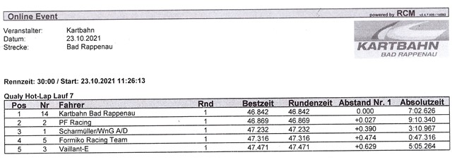 Nach beiden fünf Minuten „Shoot Out Qualies“, schafften es dann die Teams Formiko Racing Team, Scharmüller/WnG A/D, Vaillant-E, Kartbahn Bad Rappenau und PF Racing ins angestrebte TOP 5 Qualy. Hier musste dann wieder bewiesen werden, wer die „Hot Lap“ Runde auf dem neutralen Kart am besten zusammen bringt. Dies gelang dem Team Kartbahn Bad Rappenau (Dave Veile) und PF Racing (Niklas Krüger) am besten, wobei das Team Kartbahn Bad Rappenau mit 0,027 Sekunden die Nase einen Hauch vorne hatte und sich somit die Pole Position und einen Sonderpunkt sicherte. Mit einem Respekt Abstand von 0,390 Sekunden stellte das Scharmüller/WnG A/D Team (Steven Grafenhorst) ihr Kart auf Startplatz drei, gefolgt vom Formiko Racing Team (Silvan Tomasi +0,474) und dem Team Vaillant-E (Fabian Siegmann +0,629).