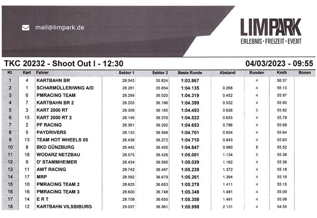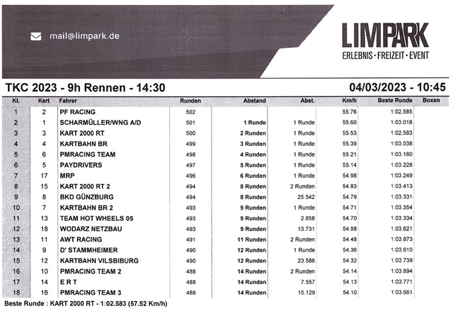 Auch beim Team auf Platz 16 (PMRacing Team 2) lief nicht alles rund. Hier war lange nicht klar, ob der Fahrer Probleme hatte oder das Kart Defekt war. Nachdem dann ein Ersatzkart bereit gemacht wurde, kam der Fahrer auch gleich in die Box….. klagte dann aber über Muskelkrämpfe und nicht über ein defektes Kart. Die Reise ging daraufhin mit einem neuen Fahrer weiter, welcher aber ohne Transponder rausfuhr, da dieser schon am Ersatzkart war. Somit musste man nochmal die Boxengasse aufsuchen, um den Transponder wieder ans Einsatzkart zu stecken. Die dadurch verloren gegangene Runde, wurde wieder gutgeschrieben. Die Teambestzeit der PMRacing Team 2 Mannschaft lag bei 1:03.894.