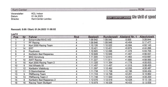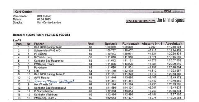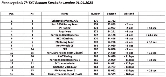 Starker Vierter wurde das Team Paydrivers aus Neckartenzlingen mit 24,5 Sekunden Vorsprung auf das Team der Kartbahn Bad Rappenau welche somit Fünfter wurden. Mit 370 gefahrenen Runden auf einem mehr als zufriedenstellenden sechsten Platz die drei Jungs vom Team BKD Günzburg. Nur 6,6 Sekunden dahinter die Mannschaft aus dem Ingolstädter Raum, PMRacing Team. Zweites TKC Rennen, zweites mal in die TOP 10 gefahren, auf Platz 8 das junge Team Hot Wheels 05 aus Eiselfing. Und auch dem Team ERT aus dem hohen Norden gelang der Sprung in die Top Ten, mit 367 gefahrenen Runden erreichte man den guten neunten Platz.