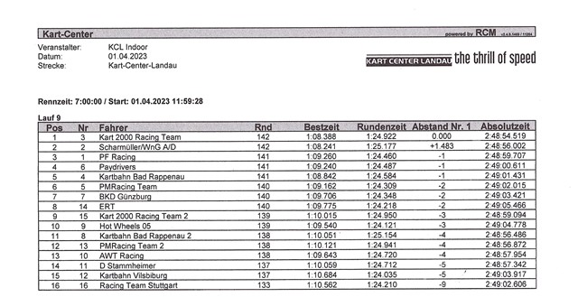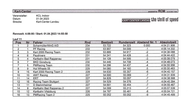 Im Kampf um den Tagessieg gab es nicht viel zu rechnen, der ging souverän an das Team Scharmüller/WnG A/D mit über 2 Runden Vorsprung. Dazu kommt der Sonderpunkt durch das Erreichen der Pole Position + ein Sonderpunkt für die schnellste Rennrunde des Tages (Johannes Neuhauser mit einer 53.722 sec). Platz 2 mit 374 gefahrenen Runden ging an das Kart 2000 Racing Team aus Eiselfing. Das Podium komplettierte das PF Racing Team auf Platz 3 mit 44 Sekunden Rückstand auf P 2.