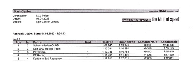 Das Super Pole Qualy ging dann mehr oder weniger souverän an Scharmüller/WnG A/D mit einer Zeit von 1:09.945, gefolgt vom Kart 2000 Racing Team + 0.346 sec., Paydrivers + 0.843 sec., PF Racing + 1.546 sec. und dem Team der Kartbahn Bad Rappenau + 2.866 sec.