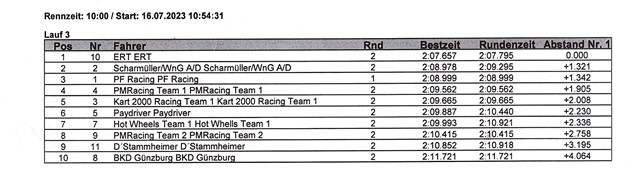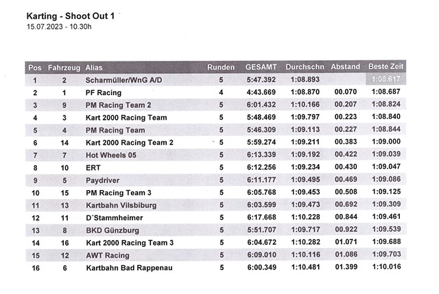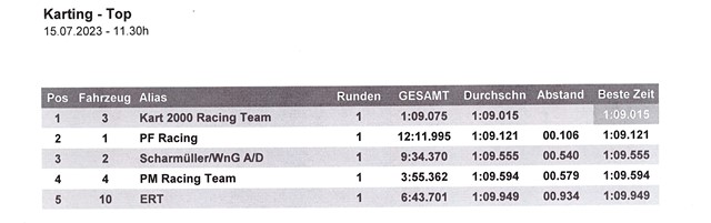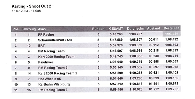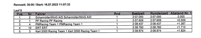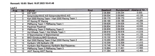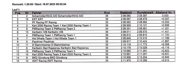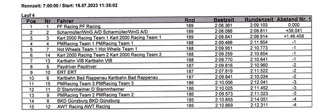 Das Rennen entschied nach 361 gefahrenen Runden ebenfalls das Team PF Racing für sich. Mit nur 19 Sekunden dahinter, das Scharmüller/WnG A/D Team auf Platz 2. Mit 31 Sekunden Rückstand auf Platz 1, war es das starke Hausteam Kart 2000 Racing Team auf Platz drei. Bevor dann auf Platz 4 das Gast/Schwesterteam "Kart 2000 Racing Team 2" folgte. Wieder mit einer starken Leistung und somit erneut in den TOP 5, das PM Racing Team auf Platz 5 (Gastteam bereinigt Platz 4).