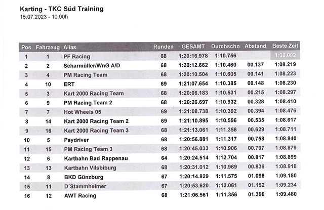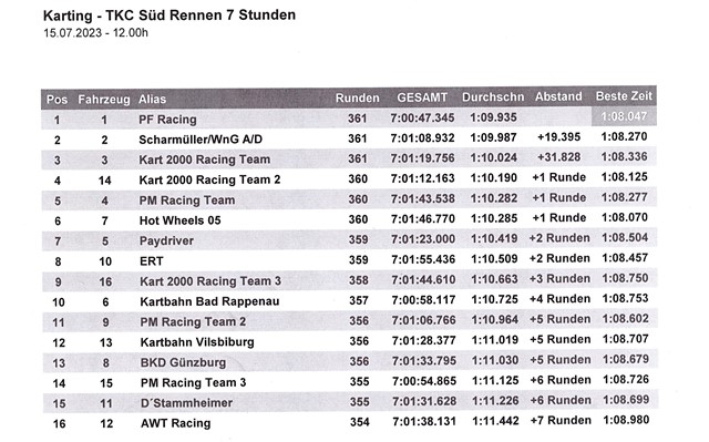 Fazit: Zwei großartige Rennen, bei zum Teil übelst heißen Temperatuten, 31 Teams, engen Entscheidungen, einem Defekt in zwei Tagen, nur einer Gelblichphase, Tag 1 = 1 Zeitstrafe (Kart angeschoben in der Boxengasse) Tag 2 = 3 Zeitstrafen (2 x am Karttausch Schild vorbei gefahren und einmal ein Frühstart beim Karttausch), zwei sehr gut vorbereiteten Events Seitens der Kartbahnen, Klasse Stimmung, dem ein oder anderen Sonnenbrand, PF Racing mit Doppelsieg, einem fliegenden Flip Flop in der Boxengasse, einer Gartendusche welche der ein oder andere Fahrer auch benutzt hat, einer Mega TKC Premiere der Kartbahn Vilsbiburg, vielen bunten TKC T-Shirts usw.