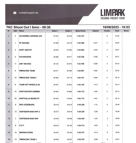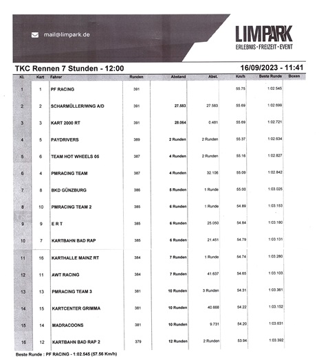 Das Rennen in Limburg war einmal mehr ein sehr schönes, spannendes und faires Rennen. Wenn da nur diese Probleme mit den nach hinten rutschenden Sitzen nicht gewesen wäre. Einige Fahrer/innen hatten große Probleme damit und mussten sich fast ründlich den Sitz wieder nach vorne rutschen, da dieser irgendwie nicht richtig einrasten wollte. Dennoch waren die Karts sonst top in Schuss und schnurrten wie Kätzlein. Ein Rennen ohne Defekt, ein Rennen ohne eine einzige Gelblichtphase, Spannung was den Kampf ums Podest angeht bis in die letzten Minuten hinein. Es gab nur zwei Strafen (Gastteam Kart 16 mit einem nervösen Finger beim Karttausch, Buzzer zu früh ausgelöst = Frühstart = Stopp/Go) und das Team mit der Kartnummer 7 hat sich leider verrechnet und ihren Fahrer (sechs Minuten zulange fahren lassen und das auch noch im Heavy Turn = 6 min Fahrzeitüberschreitung = 70 Sekunden Zeitstrafe). Sonst ein runder, gelungener Renntag.