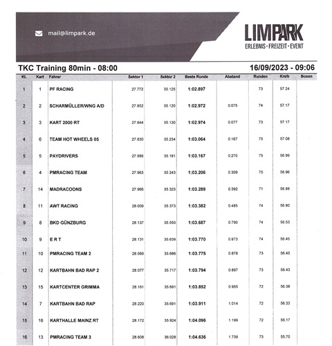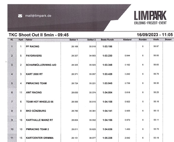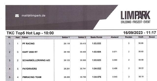 PF Racing triumphiert erneut, nicht einrastende Sitze Als Ersatzbahn für das eigentlich angesetzte Rennen in Liedolsheim, ging es für die TKC Karawane noch einmal in den Limpark nach Limburg.16 Teams gingen an den Start, bei für Limburg verblüffendennormalen (warmen) Temperaturen. |