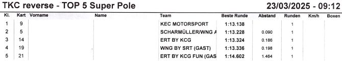 Den ersten Saisonpunkt im Jahr 2025, holte sich dann das Gastteam aus Polen (WINN Racing), indem es sich die Pole Position im „TOP 5 Super Pole Qualy“ sicherte. Es folgten auf den Plätzen dahinter, das Kart 2000 Racing Team, Team Hardcore, das Gastteam MMR Sachsen sowie das Gastteam WnG by SRT.