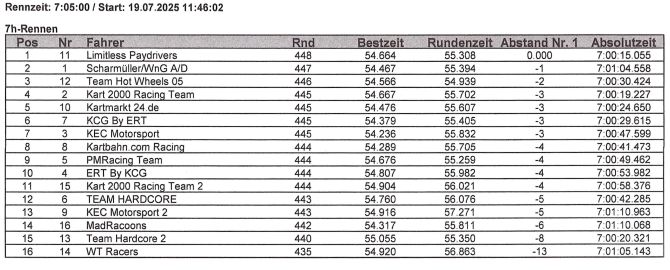 Ein erneuter TKC Premierensieger mit dem Team Limitless Paydrivers, KEC Motorsport sichert sich beide Sonderpunkte, mit den Teams „MadRaccoons und Kart 2000 Racing Team 2“ hatten wir wieder zwei Gastteams dabei, Scharmüller/WnG bleibt trotz Gewichtssorgen Tabellenführer, das Team Hot Wheels 05 überrascht mit Podium, das Mittelfeld liefert ein wahres Foto-Finish, Kart 14 sorgt für Drama, neue Motoren machten den Unterschied – und das Wetter? Zeigt sich erneut als unberechenbarer Gegner.