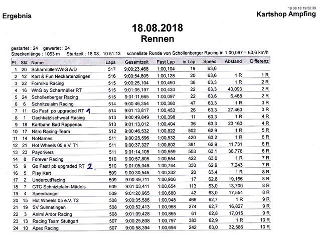 Fazit: 24 großartige Teams, eine super Strecke, bestes Wetter, alle 24 Teams innerhalb 0,9 Sekunden in der schnellsten Runde, gut vorbereitete Karts, einige überraschend starke Teams, super Crew, nur einen technischen Defekt, 20 Zeitstrafen, super Stimmung auf wie neben der Strecke, gleiches Podium wie schon das ganze Jahr, enge aber immer faire Zweikämpfe, nur eine Gelblichtphase, strahlende Gesichter, einem spannenden top Qualy, sich im Kart verbiegende Fahrer/innen um möglichst Windschlüpfrig zu sein, großartige neue TKC Gastteams und Gesichter, super Outdoor Premiere, 2019 steht nix im Wege usw.