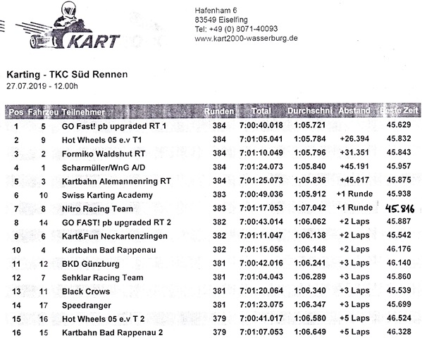 Mit einem starken Endspurt auf Platz 9 fuhr das Team Kart&Fun Neckartenzlingen mit der Startnummer 6. Mit der zweitbesten Rennrunde des Tages beendeten sie das Rennen mit 2 Runden Rückstand auf Platz 1 und 28 Sekunden auf Platz 8. Die absolut schnellste Rennrunde verpassten sie dabei nur um 0,003 Sekunden (Teambestzeit: 45:542). In der TKC Jahreswertung rangiert man weiterhin solide auf Platz 6.